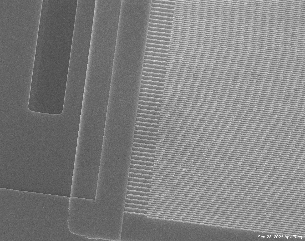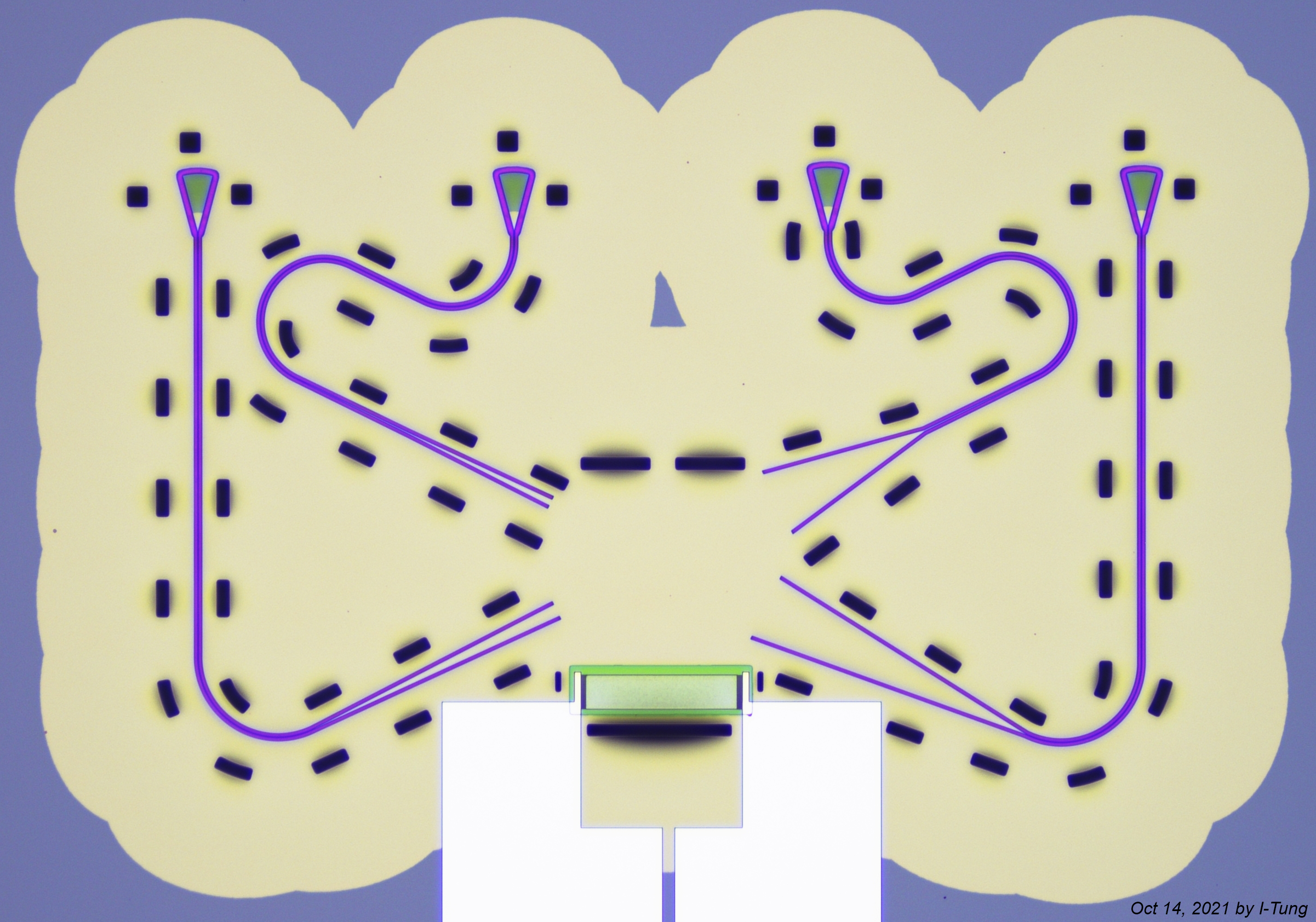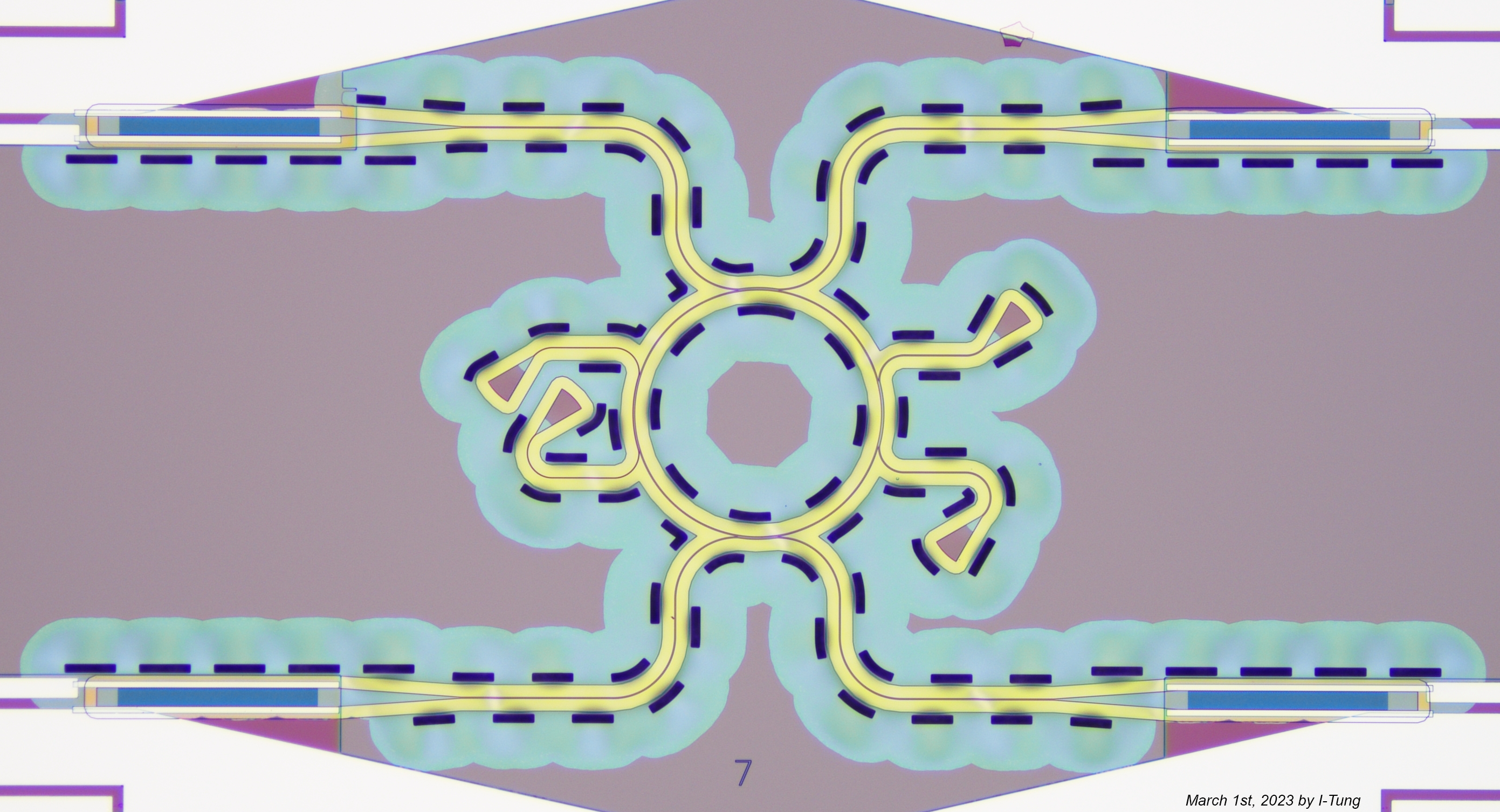 An acousto-optic frequency shifter (AOFS) on a chip. Published on Advanced Materials, 36(5), 2305434.. Zoom-in of the AOFS aluminum finger. Spring at the red square. A ring through which light and sound wave travel – an optomechanical ring resonator (OMR). Published on Nature Communications 14, 7594.